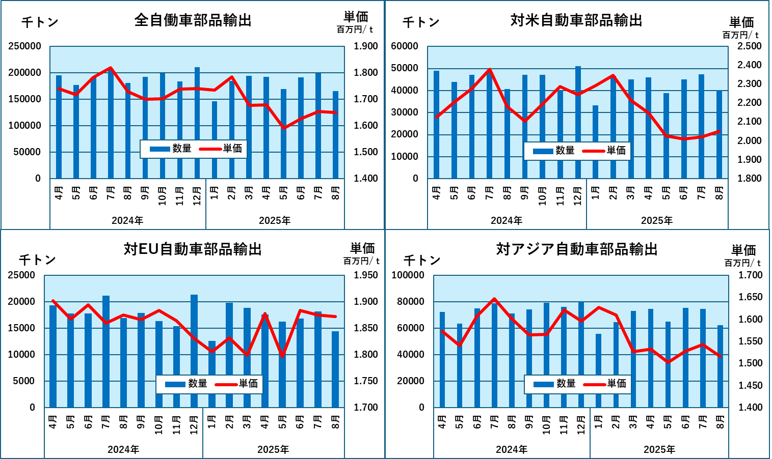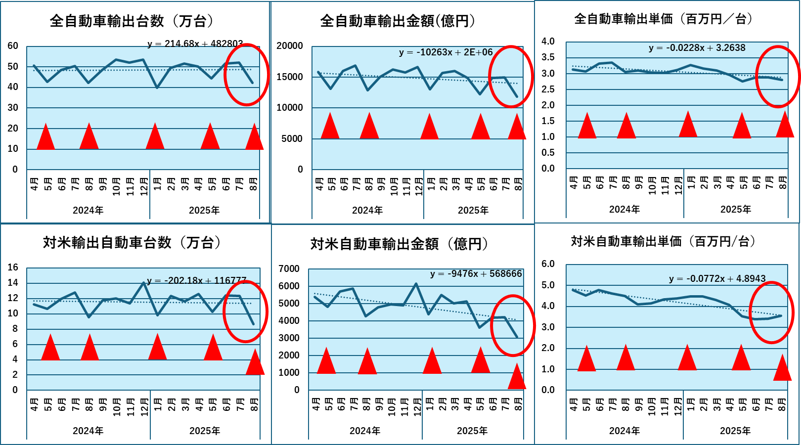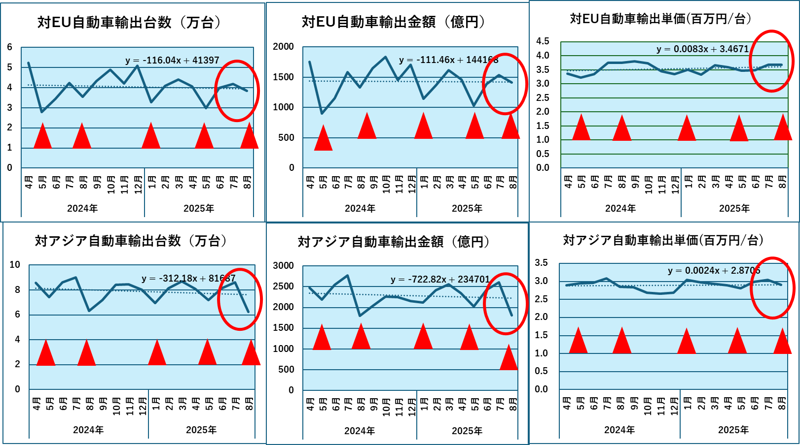 図は左から輸出台数、輸出金額、単価であり、上段から順番に対全世界、対米、対EU、対アジアです。赤い△は1月、5月、8月を示しており、これらの月は稼働日数が少ないため国内の生産台数が減少し、それにより輸出も少なくなる傾向にあります。
