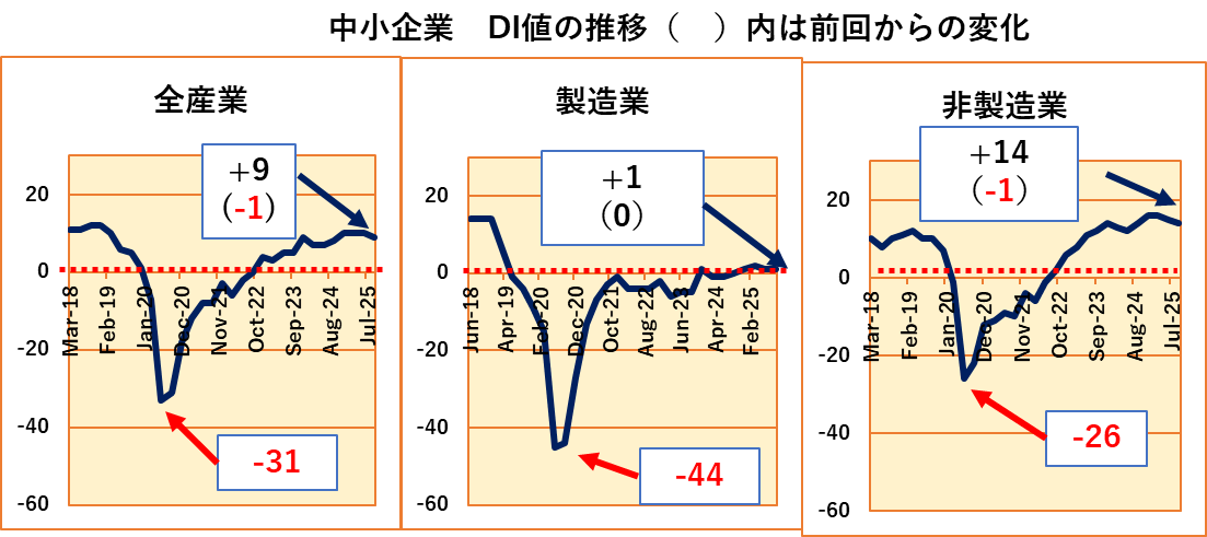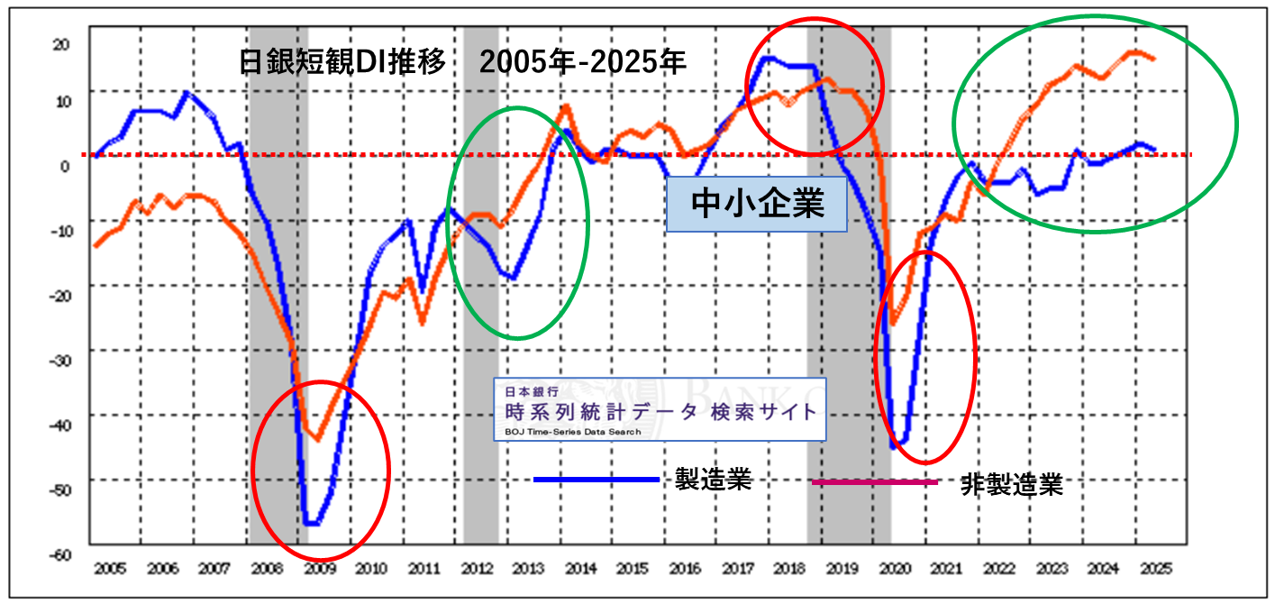 まず中小企業における製造業と非製造業のDI値の推移です。2005年から2025年にかけての推移を示していますが、このところ気になっているのは、製造業と非製造業の差がなかなか縮まらないことです。この20年間では、リーマンショックとコロナ禍という大きな経済停滞期がありました。これら停滞期では、一時的に製造業の方が落ち込むものの、1年後には製造業が非製造業を追い越し、さらにその1~3年後に非製造業が製造業を追い越すというパターンになっています。リーマンショックの場合には、さらに好況が続けば製造業が再び製造業が非製造業を追い越すという展開になるのですが、コロナ禍後の展開は、製造業が水面上に顔を出すまで時間がかかっており、ここまでは非製造業の遥か後方に甘んじているという展開です。再び製造業が非製造業を追い越す日がくるのかどうかを注目しています。
