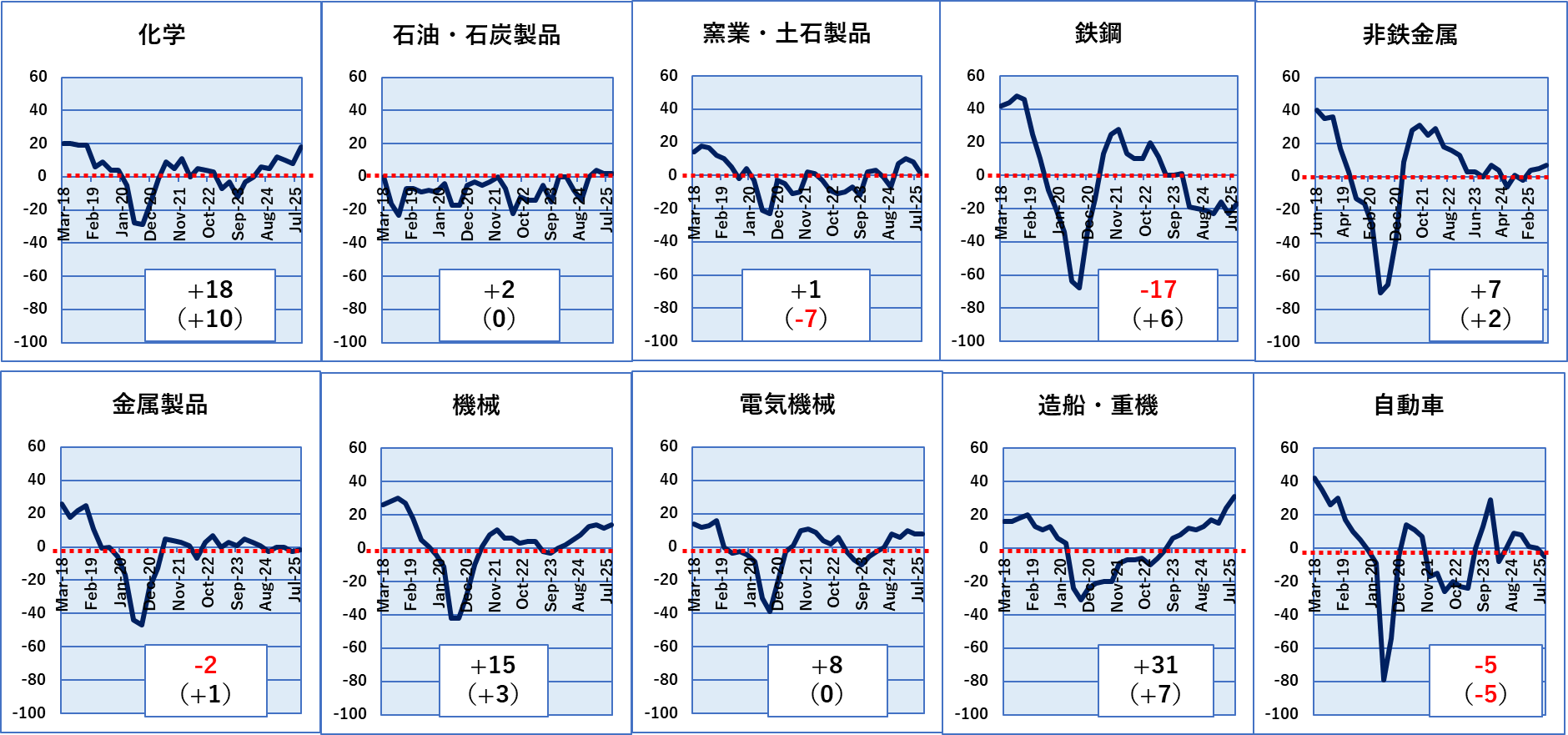 この10業種の中で9月度のDI値がマイナスなのは鉄鋼、金属製品、自動車の3業種のみとなります。