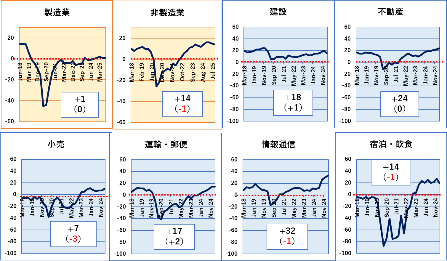 いずれも塗料にとっては重要な需要業種ですが、鉄鋼と金属製品は前期からは回復傾向にあり、自動車のみがDI値もマイナス、前期からの推移もマイナスでした。トランプ関税の影響と推測します。