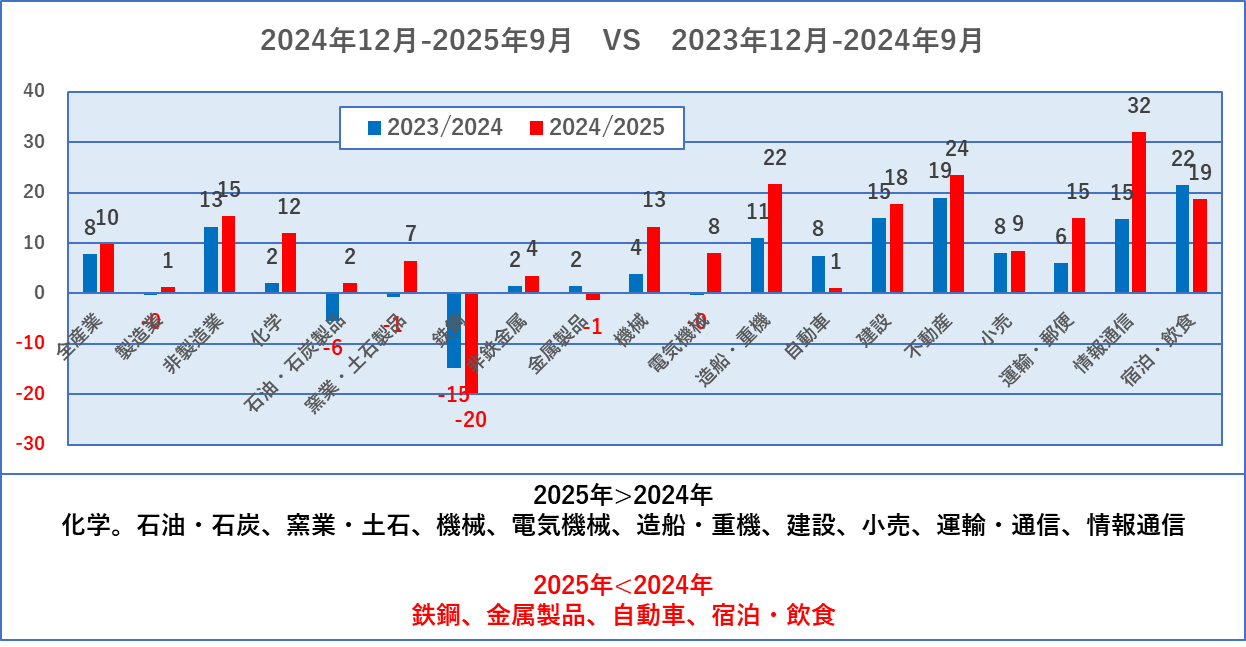 直近の1年間とその前の1年間を比較しました。具体的には2024年12月から2025年9月までの4回の調査結果の平均と2023年12月から2024年9月までの4回の調査結果の平均を比較した図です。