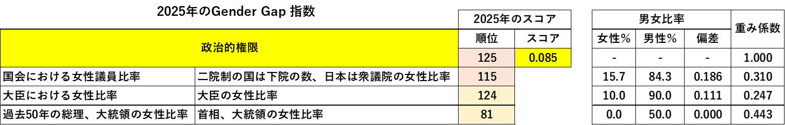 となるとこの「政治的権限」は何を基準に決めているのかということになりますが、項目は3つしかありません。下表をご覧ください。日本の2025年のGender Gap指数のうち「政治的権限」の詳細です。