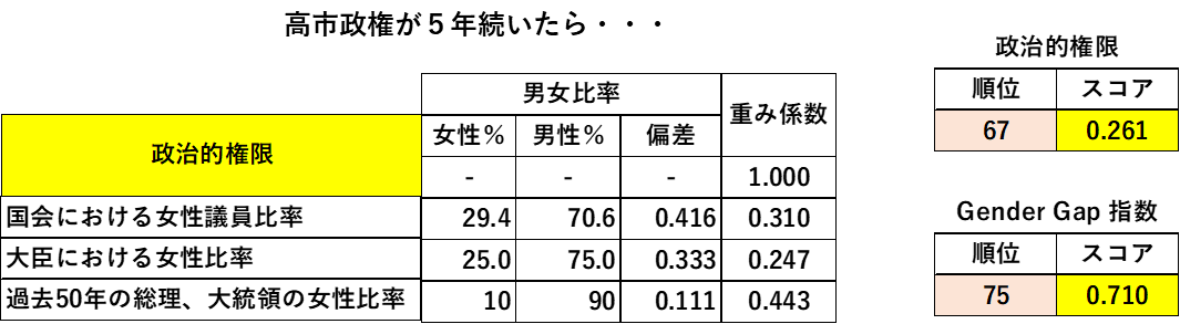 以下は全くの仮定の話ですが、夢物語ではなく実現性のある仮定ではないかと思っています。女性衆議院議員については29.4%。男性議員が70.6%と仮定します。これは今年の参議院選挙の結果を加味した現在の参議院の男女比率で偏差は0.416となります。大臣については、女性25%、男性75%、つまり20人の閣僚のうち5人を女性が占めるという仮定です。これは第2次岸田内閣時代に実績があり、この時の偏差は0.333となります。そして高市総理には5年間務めてもらうと仮定します。いささか長期政権過ぎるのではないかというご批判は承知のうえで、このくらいの年数にしないとスコアを大きくできませんので悪しからずご了承ください。この時の偏差は0.111となります。ここまでで計算した偏差に係数をかけて合計すると政治的権限のスコアは0.261となり世界148か国中の67位と一気に55位ジャンプアップします。