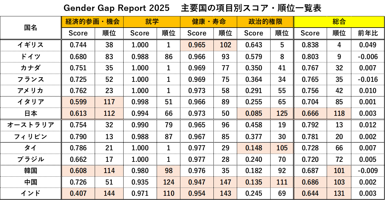 4つの項目のスコアを単純平均したもので、4つの項目とは「政治的参画・機会」、「就学機会」、「健康・寿命」、「政治的権限」です。日本はG7の中で最下位であり、上記4項目の中で「就学」と「健康・寿命」は万点に近いスコアながら、「経済的参画」と「政治的権限」で後れを取っているのが下位低迷の主要因となっています。その他の下位の国も同様で、後れをとっているのは、「経済的参画・機会」と「政治的権限」に限られると言っても良いほどです。さらに言えば、日本の「政治的権原」についてはこの表のどの国よりも低い数値になっています。