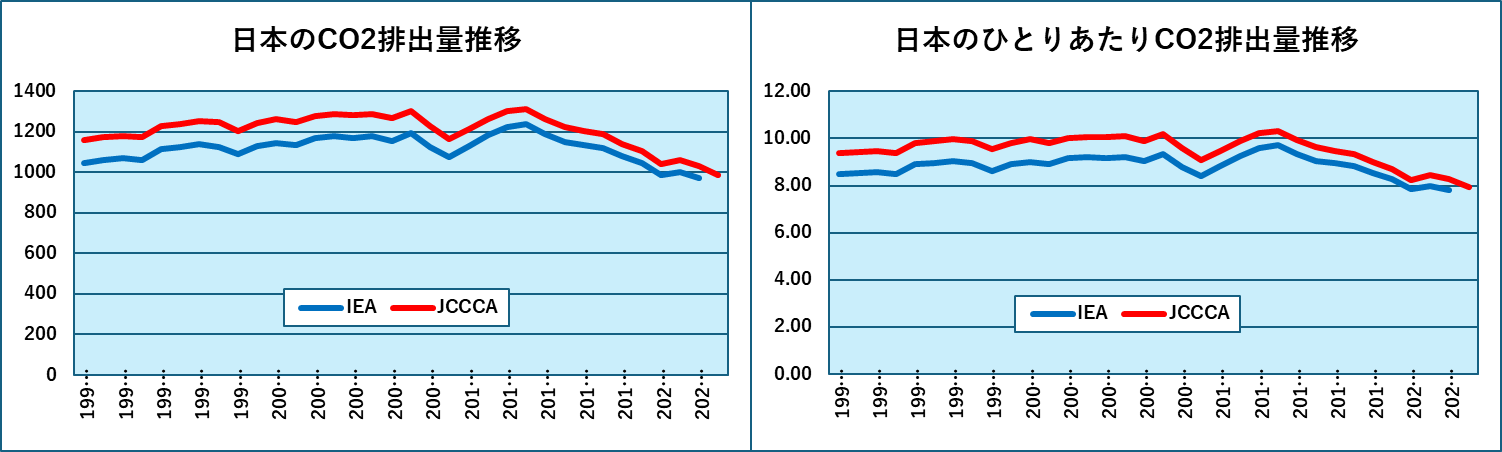 これに比べべるとIEAのデータではそれほど急激に減少しているとは見えません。そこでJCCCAとIEAのデータを同じグラフに描いてみました。左が総排出量、右がひとりあたり排出量の推移です。