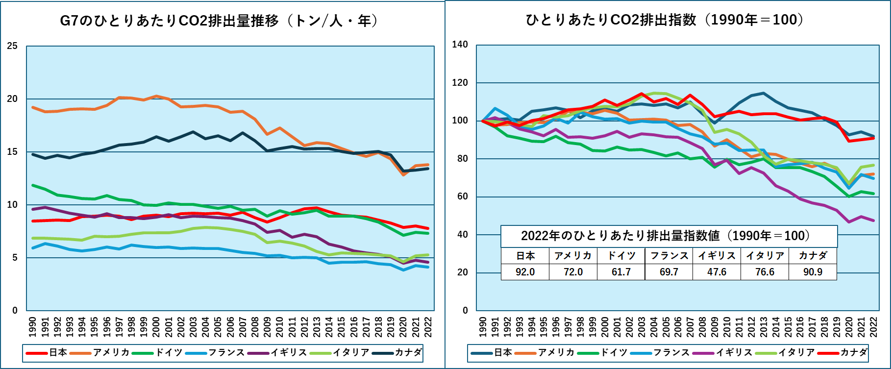 ひとりあたり排出量についても同様な状況です。1990年=100とした指数では日本はカナダと並んで最も減少ペースが遅い国となっています。