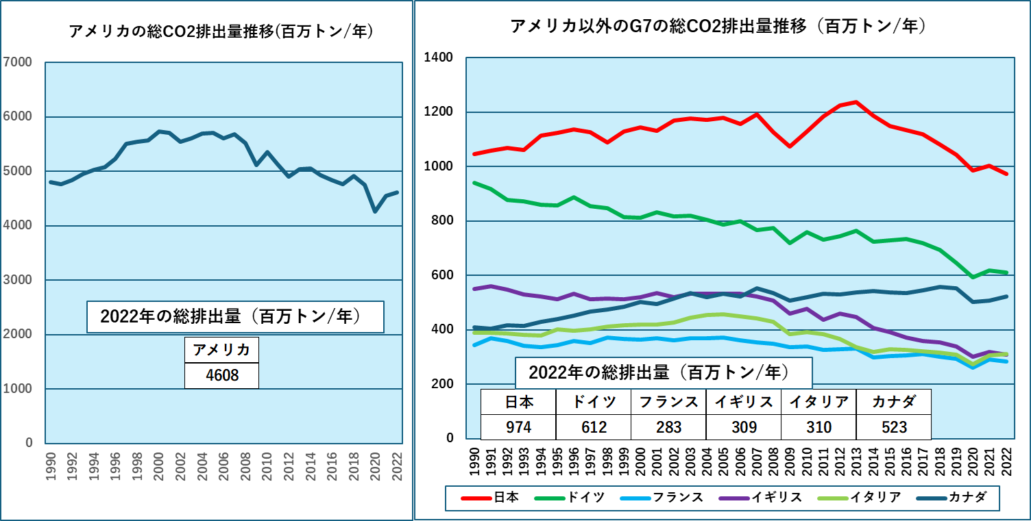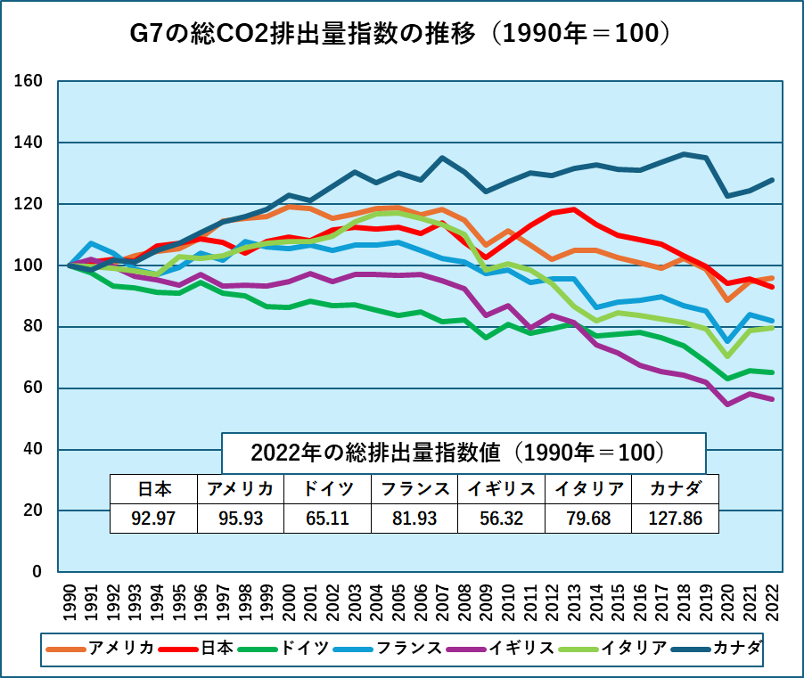 いずれにせよ日本の二酸化炭素排出量は先進国としてはどのような位置にあるのか改めて気になりましたので、G7各国と比較してみました。