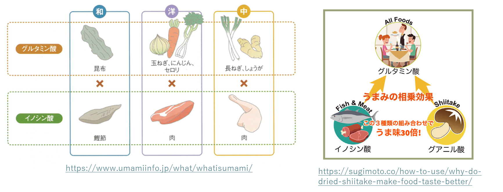 まず初めに「うまみ」を感じさせる物質は何でしょうか?これはご存知の方が多いと思いますが、アミノ酸です。その代表格はグルタミン酸とイノシン酸で、この二つが組み合わさると個々のアミノ酸の7倍ものうまみを感じさせることができると言われています。さらにこの二つにグアニル酸が加わるとなんと30倍ものうまみを感じるとも言われています。(下図)