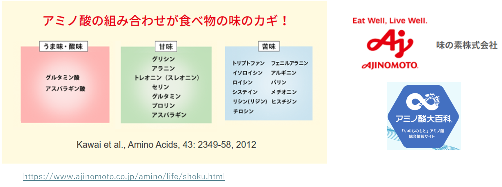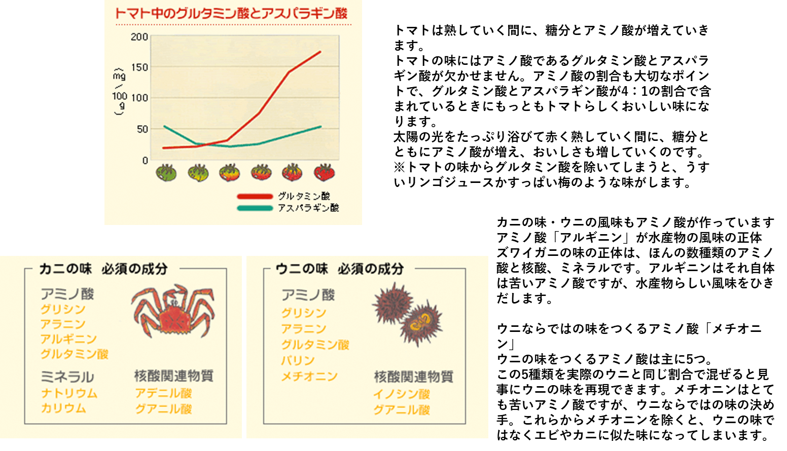 トマトについてはグルタミン酸とアスパラギン酸(ともにうま味成分)の比率が4:1の時が一番おいしいとか、ウニの味を作っているアミノ酸は5種類で、このアミノ5種類をウニと同じ比率で混ぜるとウニの味になるとか、大変面白い話です。