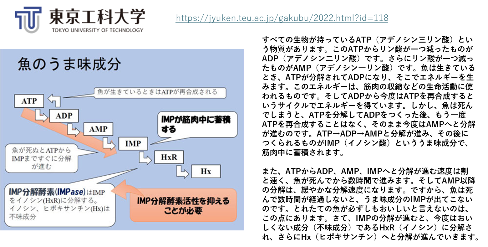 東京工科大学さんの「IMP(イノシン酸)が分解されないように、IMP分解酵素の活性を阻害する研究をしている」に興味を持ち、「https://jyuken.teu.ac.jp/gakubu/2022.html?id=118」のページの「IMP分解酵素の抑制」のところも覗いてみました。