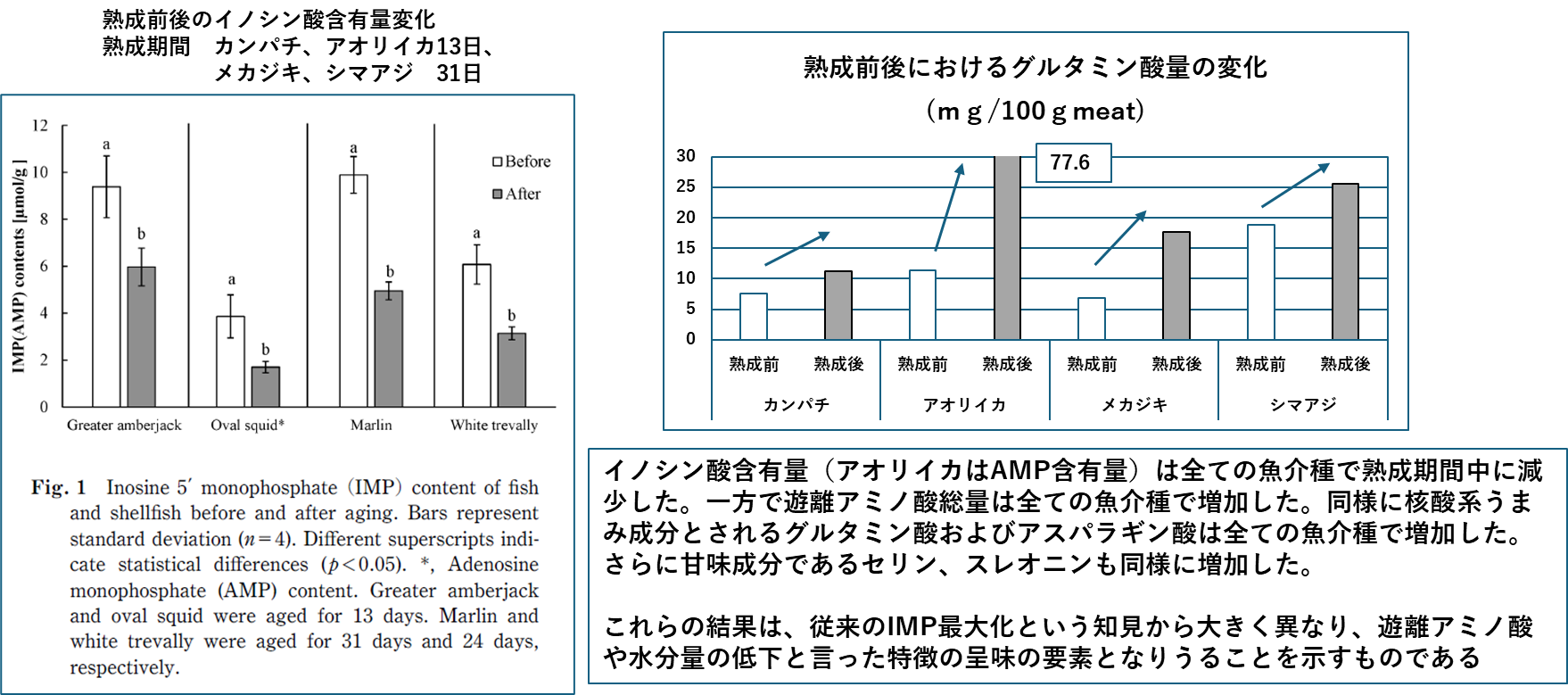 3番目の論文は、寿司種を材料として11日間熟成した場合のアミノ酸量を計測していますが、アオリイカは上述にようにIMPを経由しないため代わりにそのひとつ前段階のAMRで計測しています。