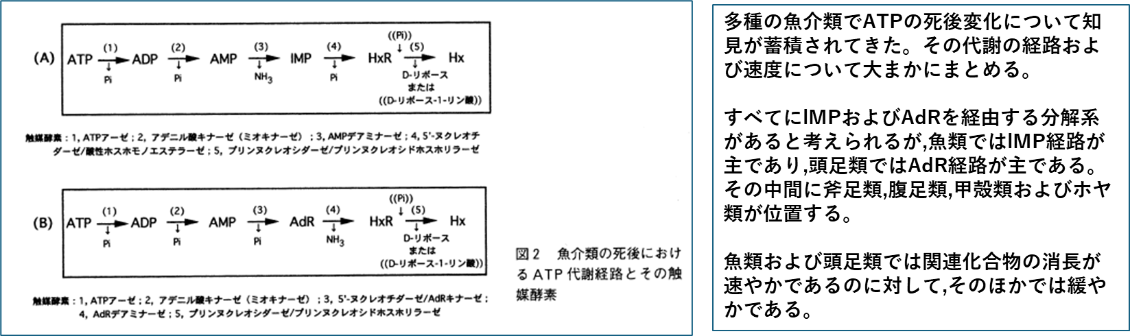 実はこの2番目の論文は熟成中のアミノ酸量のデータがありません。しかし大変重要な情報を提供してくれました。その情報とはATPについて、魚介類のすべてでATPの分解過程でIMPを経由するものではないということです。下図をご覧ください。