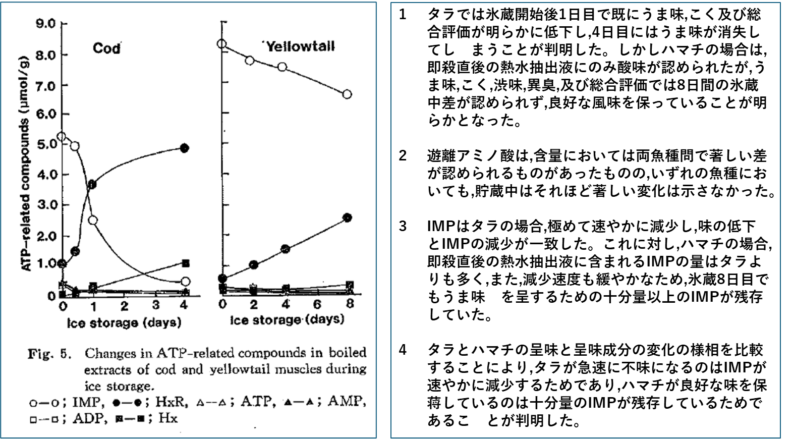 最初の論文はタラとハマチについて、熟成中のイノシン酸などATP関連物質(一連のATP分解物すべて)の推移です。うまみ成分であるイノシン酸の氷水中熟成における変化を下図に示します。白抜き丸がイノシン酸量、黒丸がその劣化物質であるHxRです。タラは一日目ですでにIMPが減少し、HxRが増加しています。ハマチの方は経過時間とともにIMPが緩やかに減少しますが、8日目までおいしく食すことができたとされています。