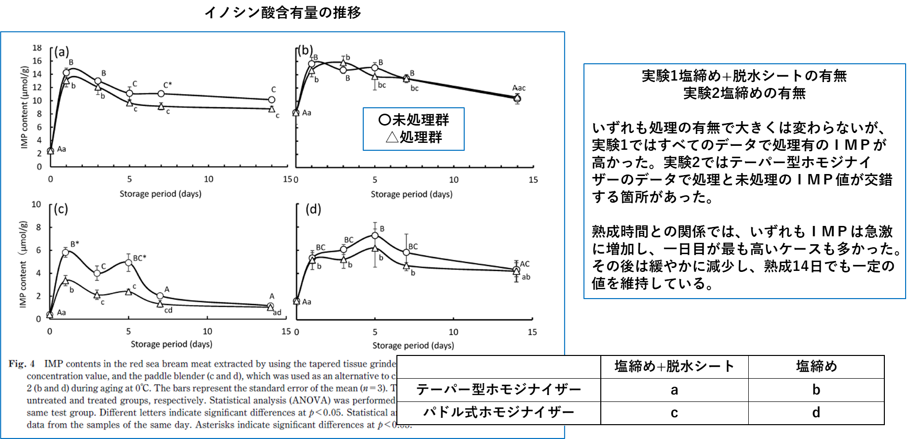 この実験の主目的は塩締めと試料の処理と器具テーパー型ホモジナイザーとパドル型ホモジナイザーの差異を確認すること思われますが、全体的にみれば、塩締めと脱水シートの使用はイノシン酸維持に効果あり、試料採取器具としてはテーパー型ホモジナイザーの方が良好であるということになります。