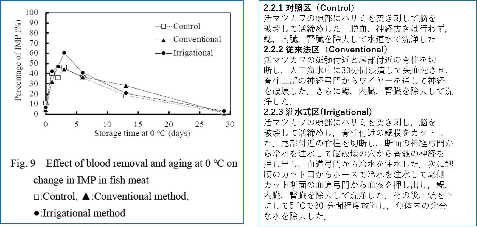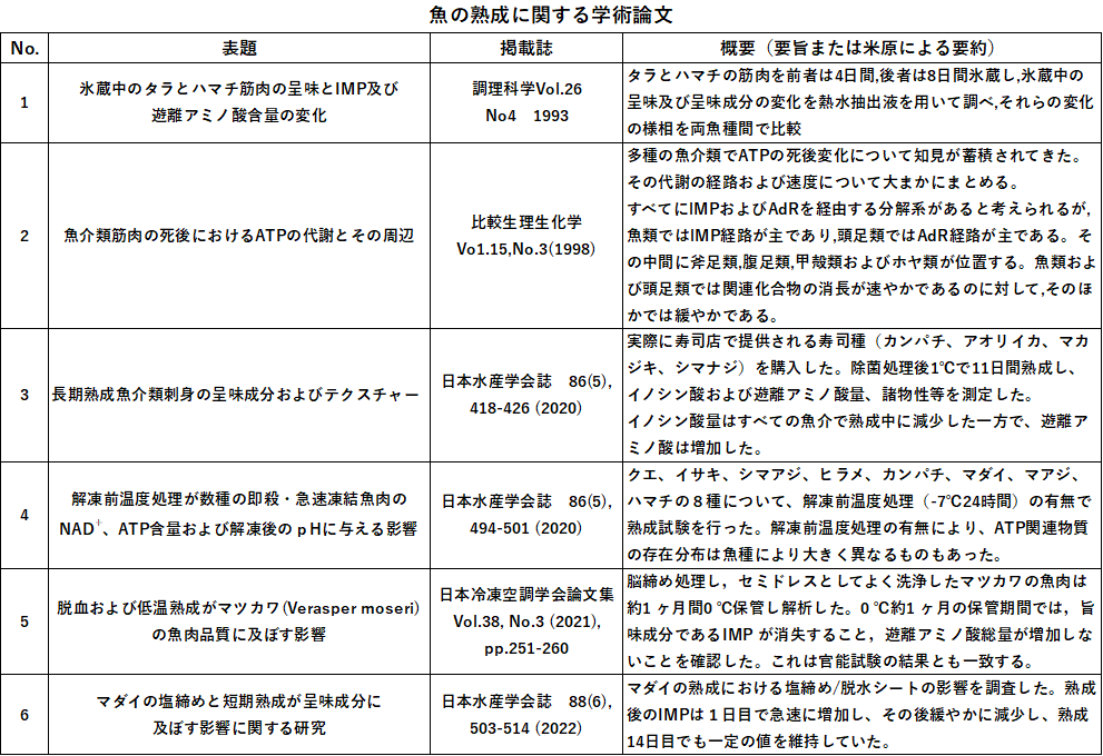 2. 熟成時におけるIMP(イノシン酸)の生成は、魚の種類にもよるものの、ATPからIMPまでの分解過程は高速で進行し、比較的短期(熟成期間1日前後)にIMPが最大値に達しその後緩やかに減少するケースが多い。文献1,文献3、文献5、文献6