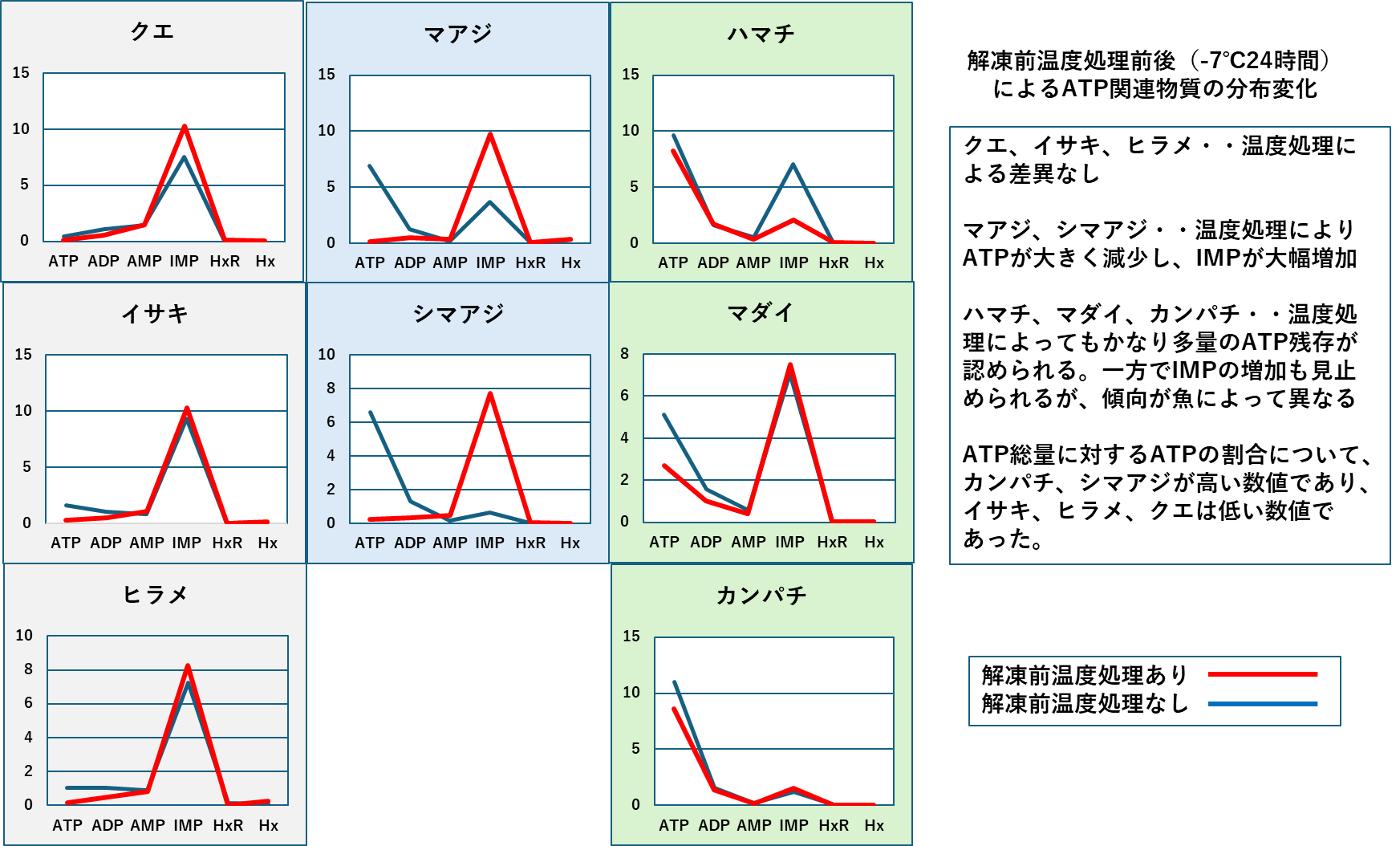 この論文では、-50℃で冷凍した8種の魚介について、解凍~熟成後のATP分解過程(ATP~ADP~AMP~IMP~HxR~Hx)の生成物ひとつひとつの分布を調べており、実験の目的としては解凍前の低温処理(-7度24時間)の効果を調べています。熟成条件は10℃24時間と短いこともあり多くの試料で十分なイノシン酸が観察されています。まだATPの分解が行われていないと思われるのはカンパチくらいでしょうか?解凍前に処理による効果が顕著なのは中列のマアジとシマアジで、解凍前温度処理を行った方が速やかに分解が進み多量のイノシン酸が生成しています。ATPの残存量から判断して、ATPの分解が速いものはクエ、イサキ、ヒラメ、解凍前温度処理で分解が加速されるのはマアジとシマアジ、分解が遅いのがハマチとマダイ、カンパチとなります。