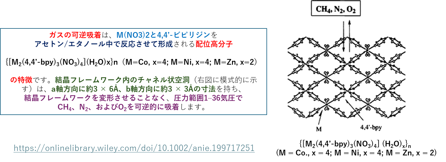 正直なところ意外に単純な構造で驚きました。金属の硝酸塩をビピリジン配位子が繋いでいるだけです。金属の種類や配位子を変えることでチャンネル構造を自在に変えるこができるというのもすばらしいところだと思います。そしてこの配位高分子は、広い圧力範囲において、メタン、窒素、酸素を可逆的に吸着できると説明されています。