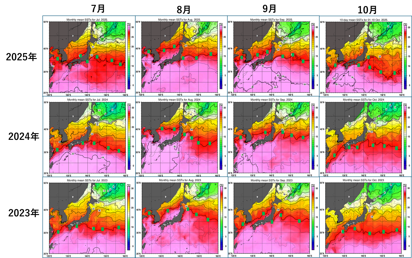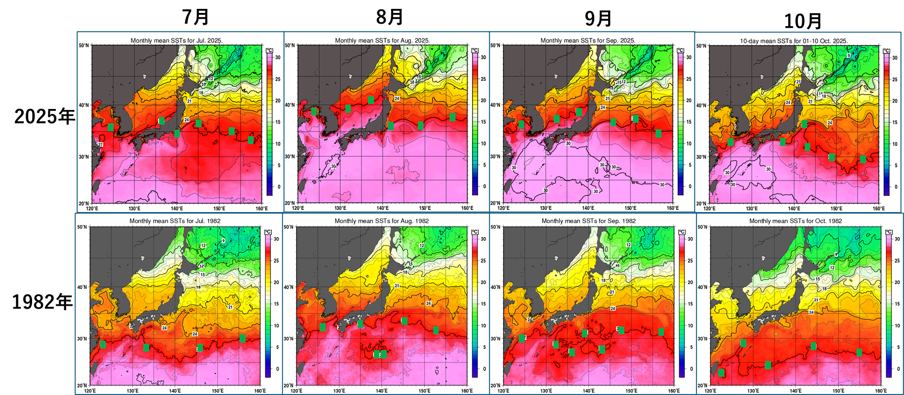 それでは早速日本近海の7月から10月までの月平均海水温の推移を見ていきましょう。日本近海の海水温度分布図について2025年と1982年(同じ形式でのデータが公開されている最初の年)とで比較してみることにします。
