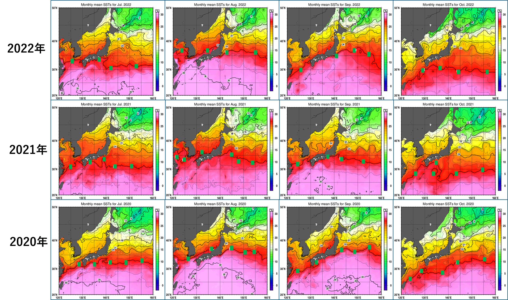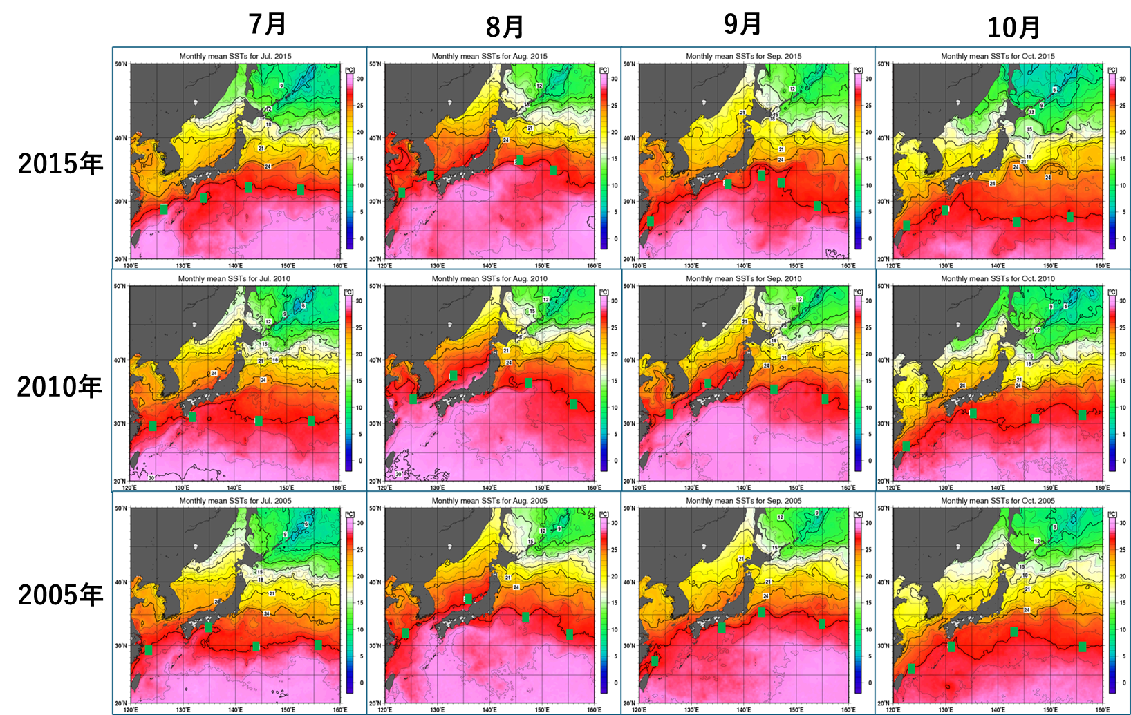 これらの図において、海水温は色で示されており、低い方から緑、黄、橙、赤、ピンクの順に高くなっています。27℃の等温線は、緑色の小さな四角形繋ぐ線として表しています。