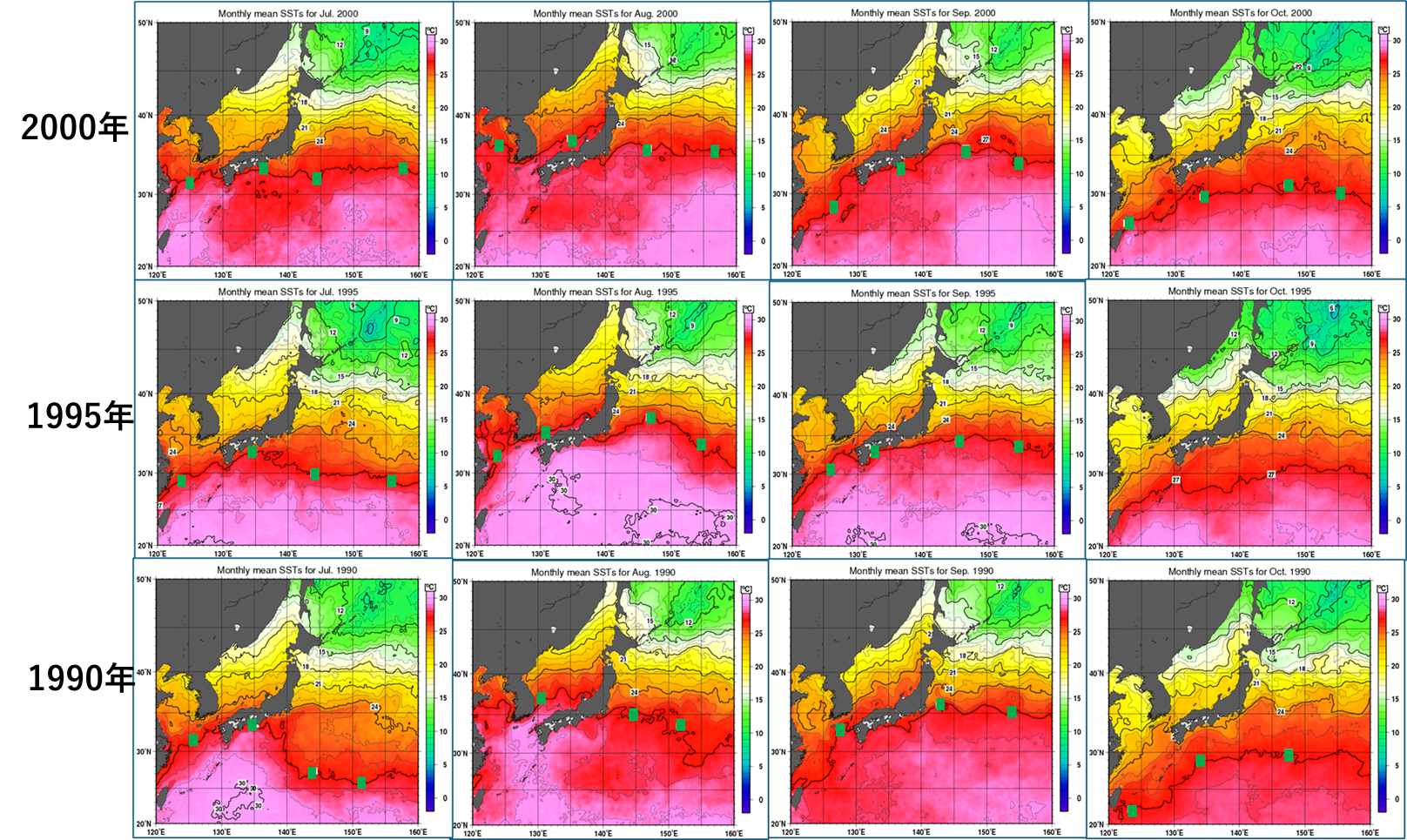 年によっての変動もありますが全体を眺め渡せば、ピンク色の高温海域は広がり、27℃の等温線は上方に移動してきていることが判ると思います。地球全体で見れば南半球よりも北半球の温暖化が激しく、北半球の中でも日本は温暖化が激しいとデータが示しています。その理由のひとつは間違いなくこうした海水温の上昇にあると思われます。