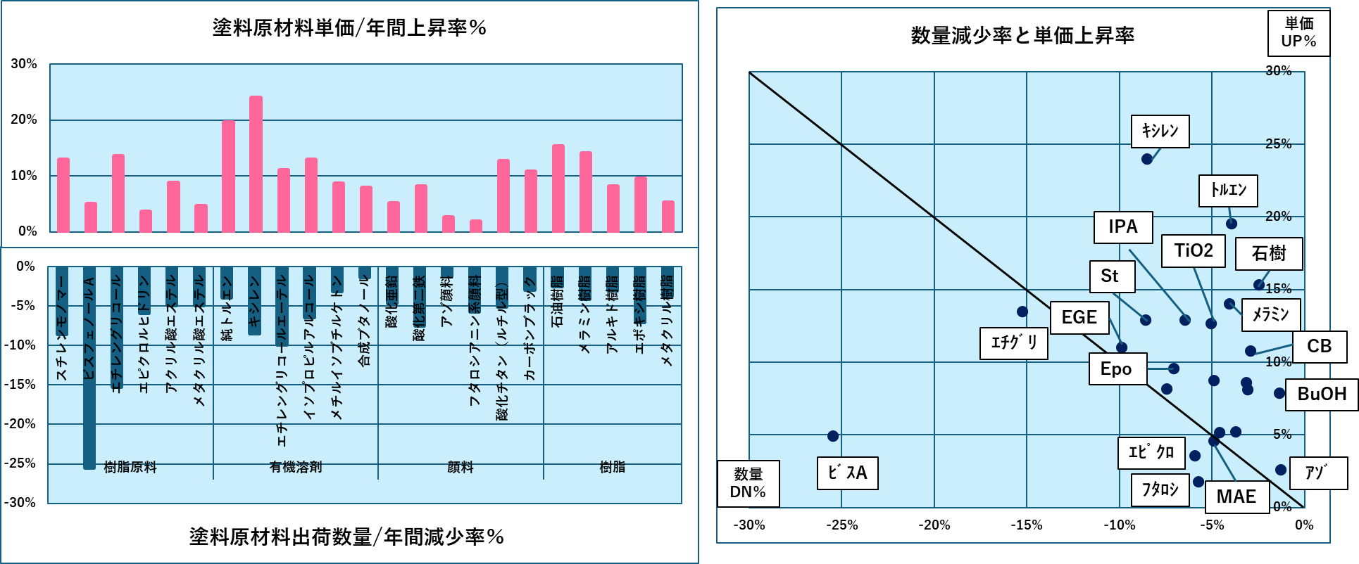 塗料原材料の供給動向・・全原料が数量減少、単価上昇