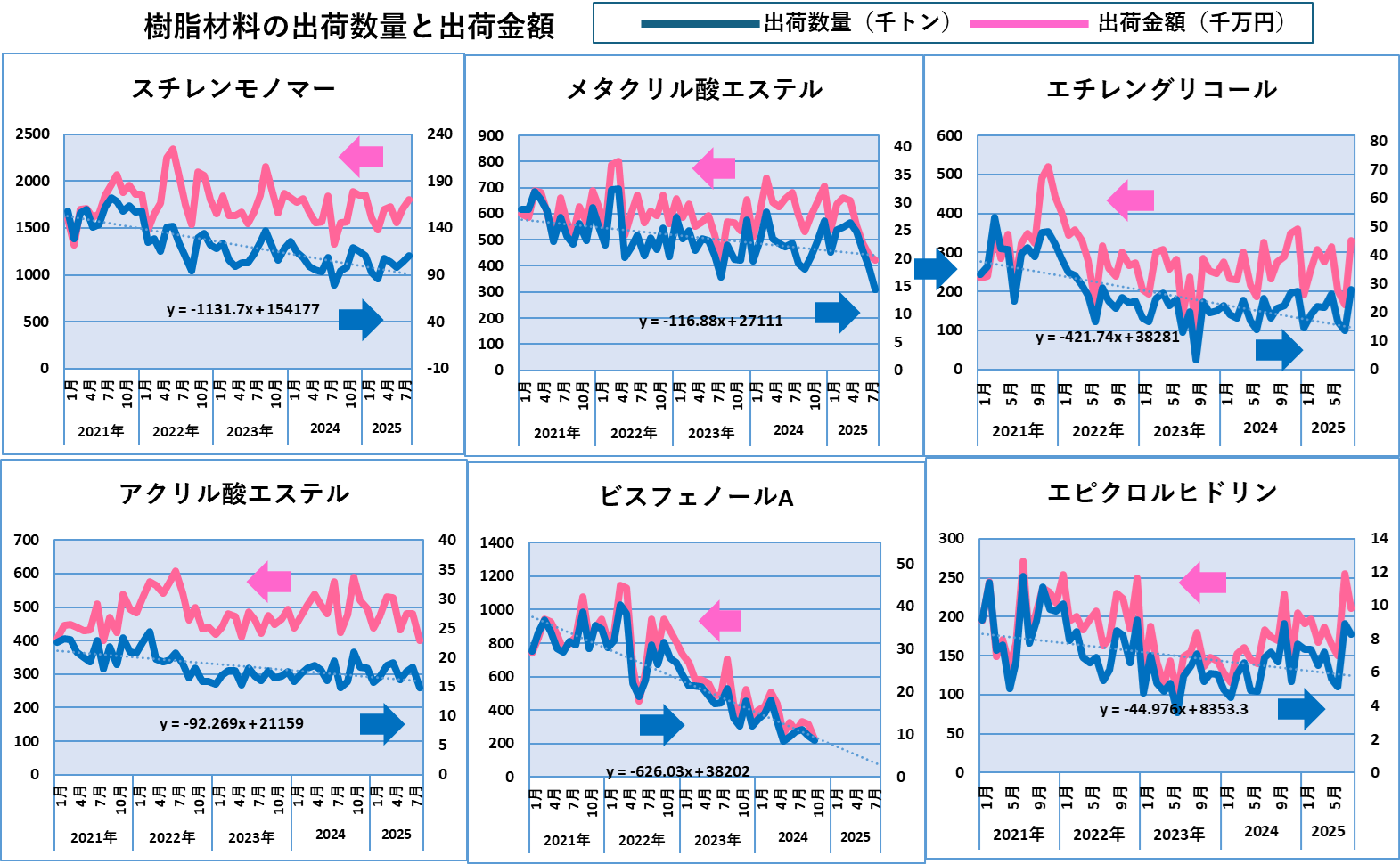 出荷数量と出荷金額をひとつのグラフに書いていますが、2021年1月の始点が同じ位置になるように第1軸と第2軸の目盛りを調節していますので、数量と金額の増え方、減り方の大小をそのまま比較できます。それでは樹脂の原料となる樹脂材料からグラフを示します。