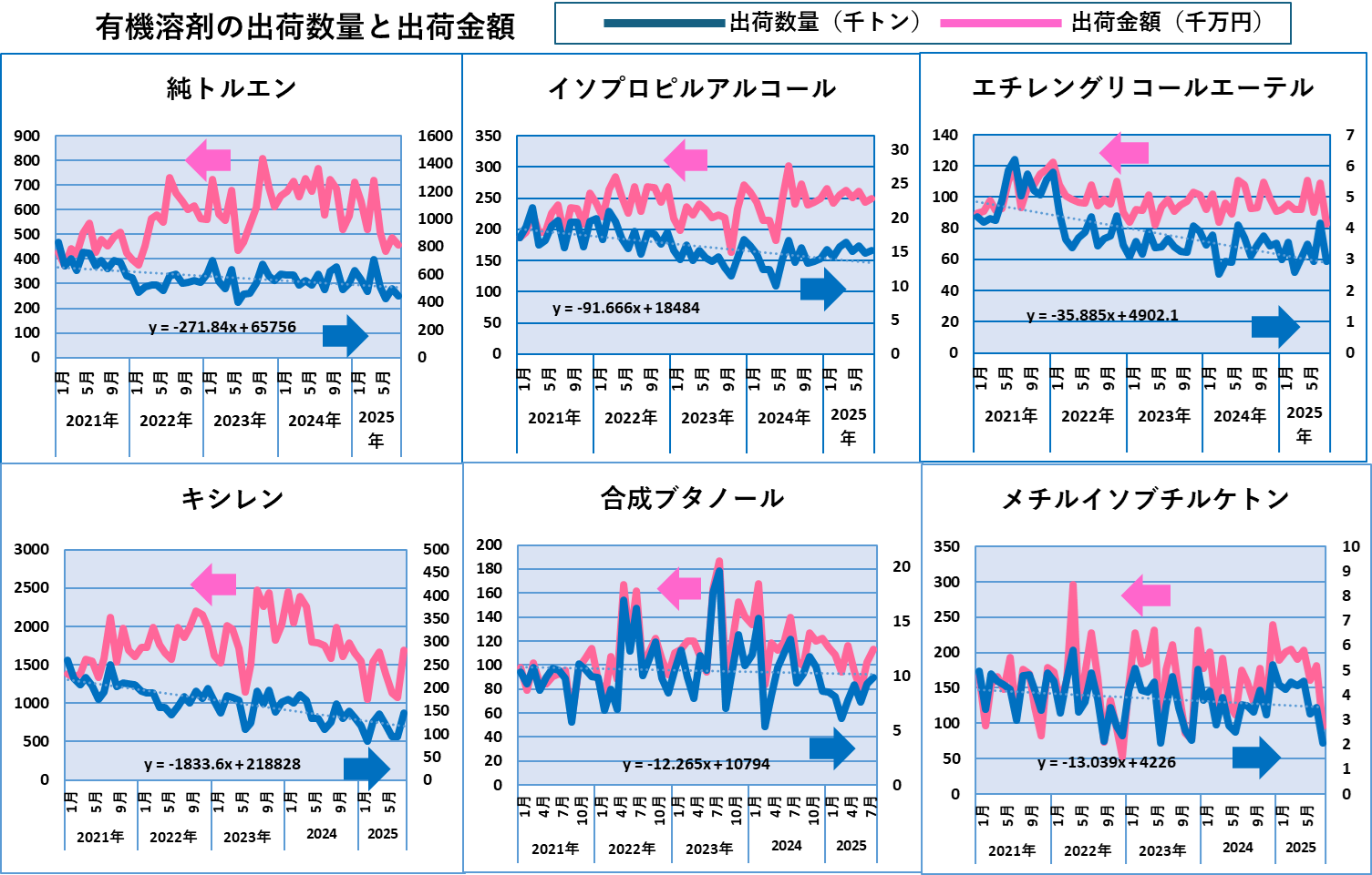 青線が数量、ピンク線が金額です。半年前と同様にすべての原料において、数量線よりも金額線が上にあります。つまり単価上昇となっています。ただし、数量減と単価増のバランスにより金額は増の場合と減も場合がありますが、多くは金額増となっています。これについては最後に考察します。樹脂材料で最も衝撃的なものはビスフェノールAです。エポキシ樹脂の重要な原料ですが、数量が価格ともに極端に減少し、経産省は統計数値の公開を中止しました。これほど極端な例はほかにありませんが、概ね数量減、金額増となって、青線とピンク線が乖離する傾向にあります。続いて有機溶剤です。