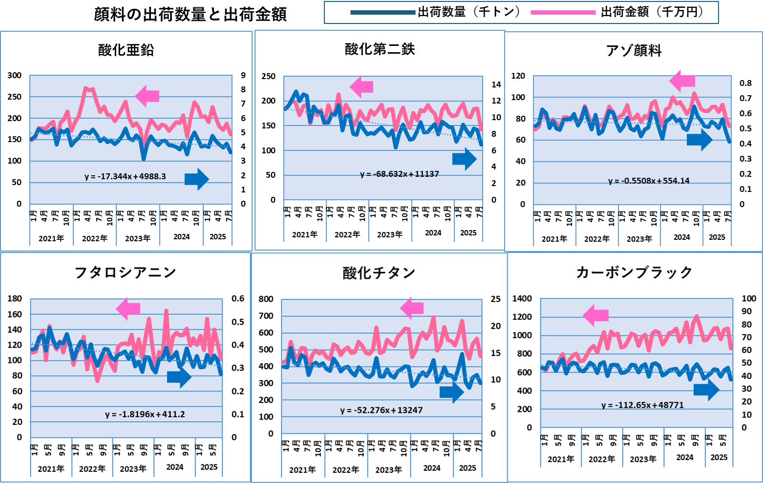 トルエンとキシレンは今回ご紹介する塗料原料の中で最も単価が上昇した材料ですが、2021年中に急激に数量と金額が乖離したままなかなか元に戻りません。他の有機溶剤も次第に数量と金額が乖離していく傾向にあります。続いて顔料です。