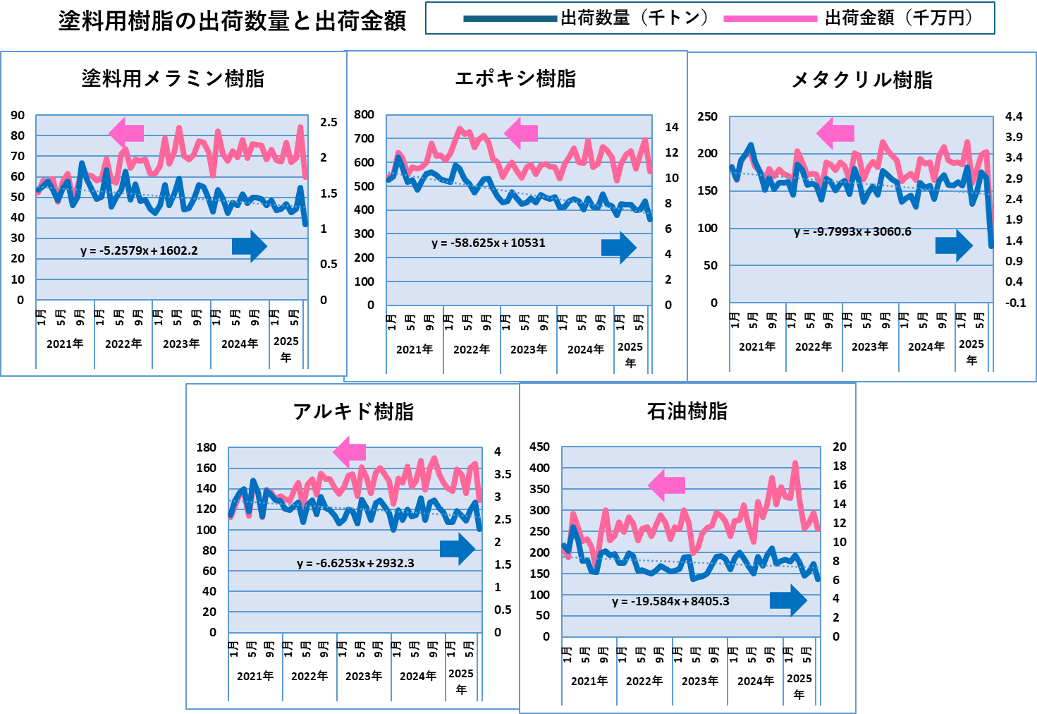 酸化チタン、カーボンといった代表的な顔料で数量、金額の乖離が続いています。アゾ顔料、フタロシアニン顔料での数量、金額の乖離が小さい理由は、この両顔料の単価がもともと高く、顔料価格に占める原材料の価格割合が低いためと推定されます。酸化亜鉛の挙動については亜鉛地金の相場の影響が考えられます。最後は塗料用樹脂です。