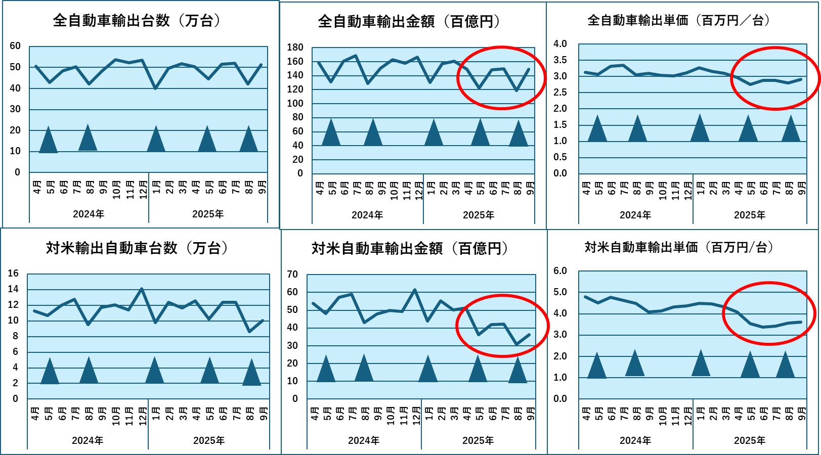 これらのグラフは地区別の自動車輸出の推移を示しており、左から月間の輸出台数(万台)、輸出金額(百億円)、単価(百万円/台)、上から順に、輸出全体、対米、対EU、対アジアです。▲は日本の休日の関係で輸出が落ち込む1月、5月、8月を示しています。