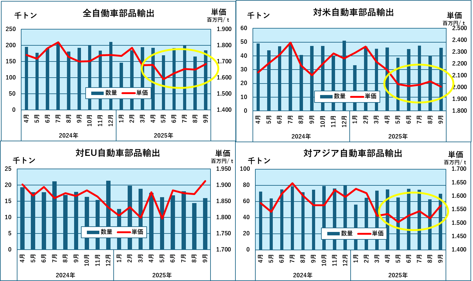 一方自動車部品については以下のようになりました。ここでも対米輸出の単価は大きくその単価を下げています。自動車部品の場合、最大の輸出先はアメリカではなくアジアですが、アジアの単価も低迷しており、輸出全体の単価も低めに推移しています。