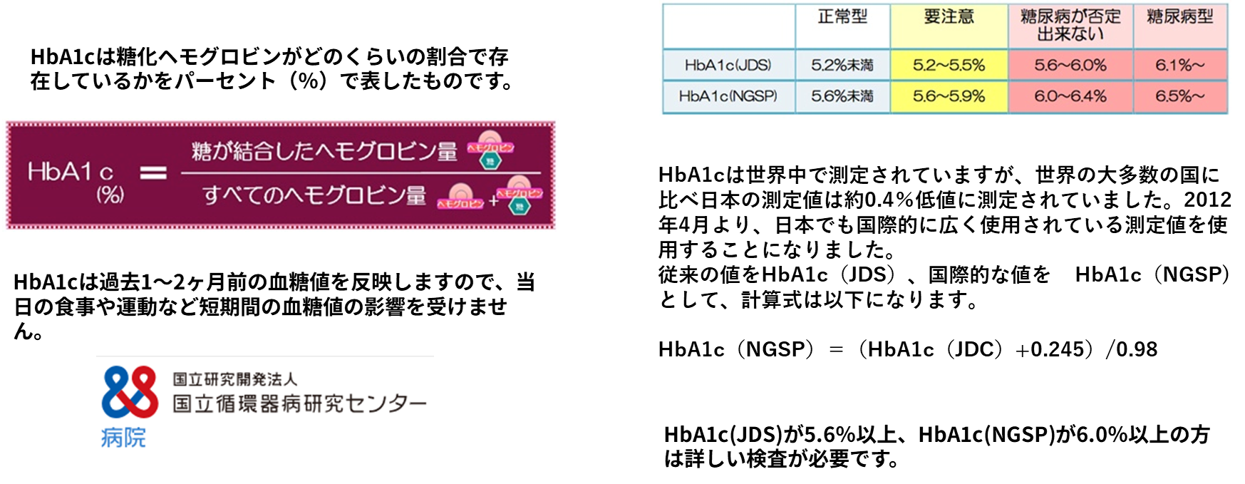このHbA1cは、2011年まで、日本の測定値が、世界の大多数の国にくらべ0.4%程度低めに測定されていました。この従来の測定値をJDS、2012年以降の新しい(世界的に同じ)測定値をNGSPとして区別しています。