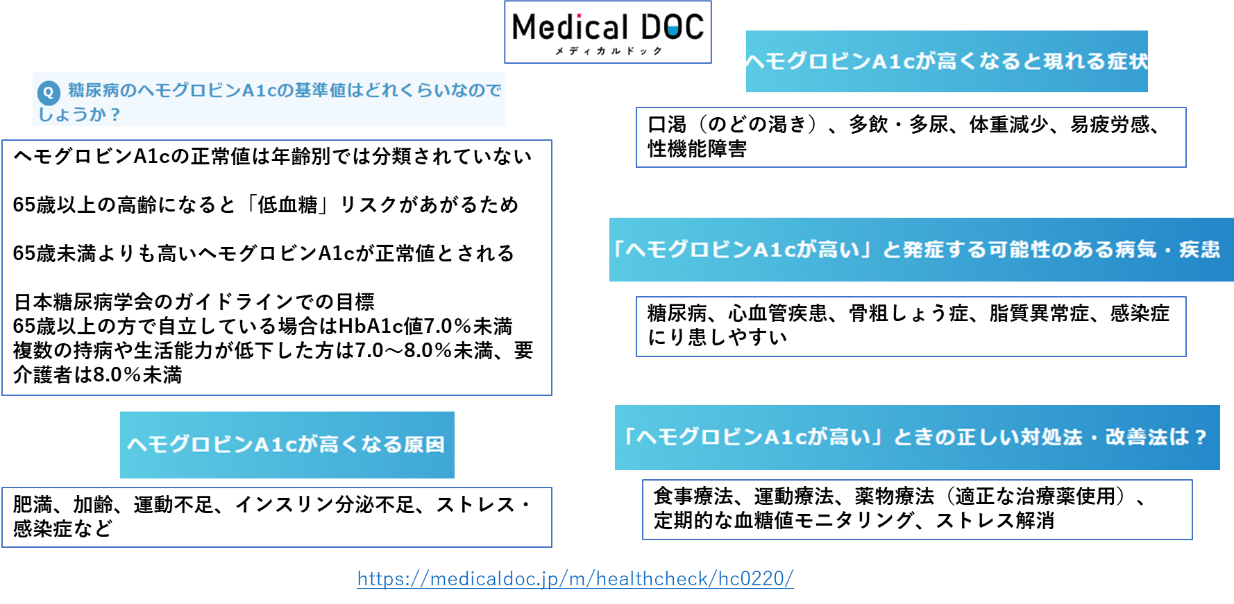 このHbA1cの閾値や、高くなる原因、高いと現れる症状・疾患、高い時の対処法を下図にまとめました。Nedical Docさんからの引用です。