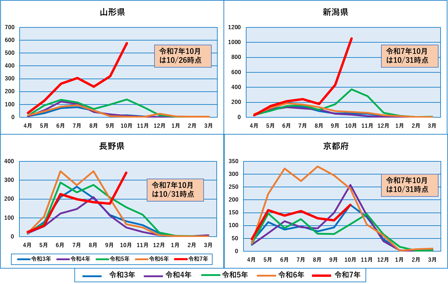 この4府県はすべて今年10月の件数が判明しましたのでグラフに描き入れており、京都を除き過去5年で最も出没多数な10月となりました。山形と新潟は、上の東北4県とほぼ同じ傾向ですが、京都府は少し様子が異なり、今年は必ずしも出没件数が過去5年で最多ではありません。むしろ昨年の方が出没件数が多くなっています。