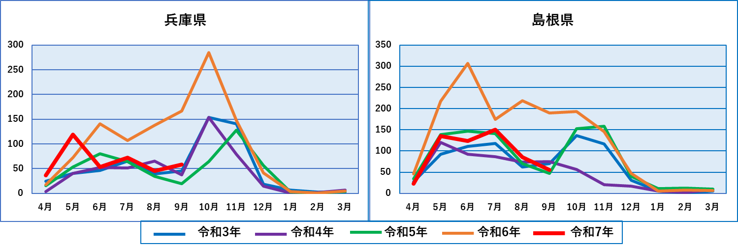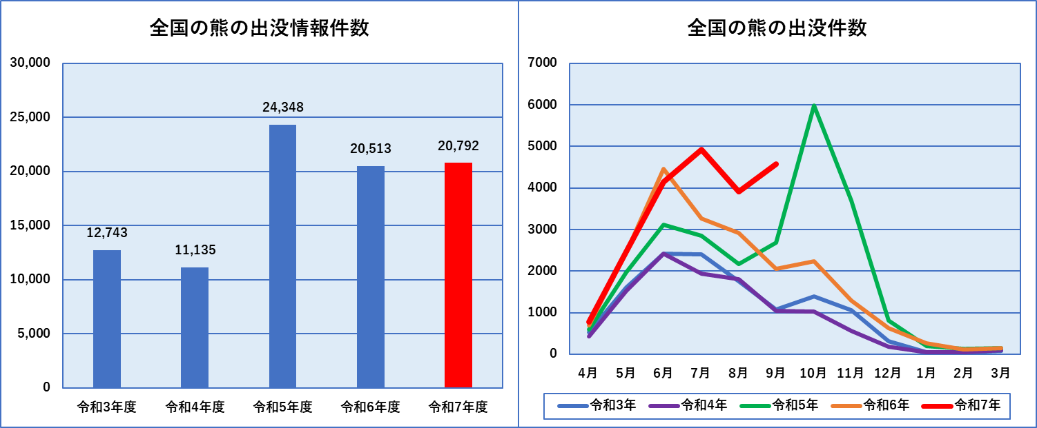 年ではなく年度(4月から翌年3月まで)のデータですが、冬季は冬眠のため出没件数が極めて少なくなるので歴年でも年度でもあまり差はありません。令和7年は9月までのデータであり、10月に多くの出没があったことから、これまでで最高だった令和5年を上回ることは間違いないと思われます。
