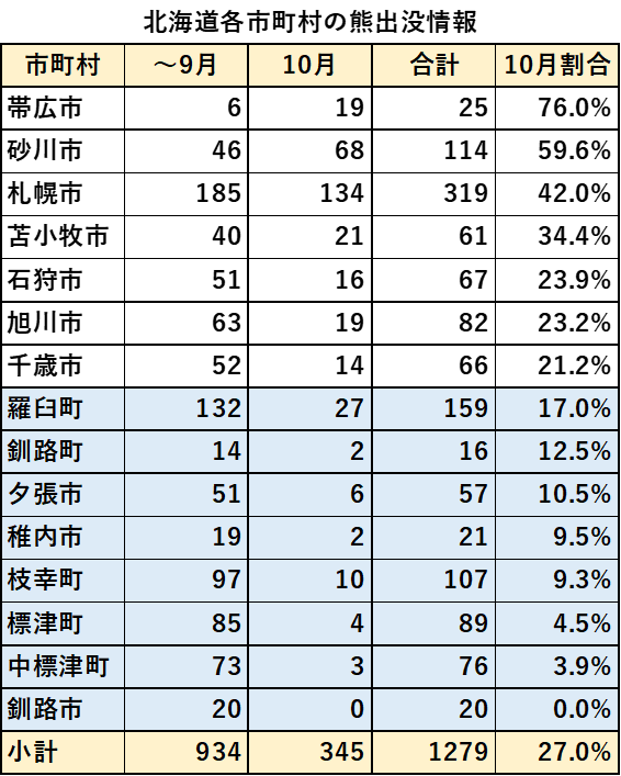 この表を見ていて気が付いたことがあります。それは水色で色付けした市町村では、10月の出没件数が9月から激減しているということです。地理的にはこうした市町村はいずれも北東側に位置しており、北海道でもより寒冷な地域だと思われます。こうした地域では、10月はもう十分寒く冬眠に入る熊が多かったのではないかと想像しています。