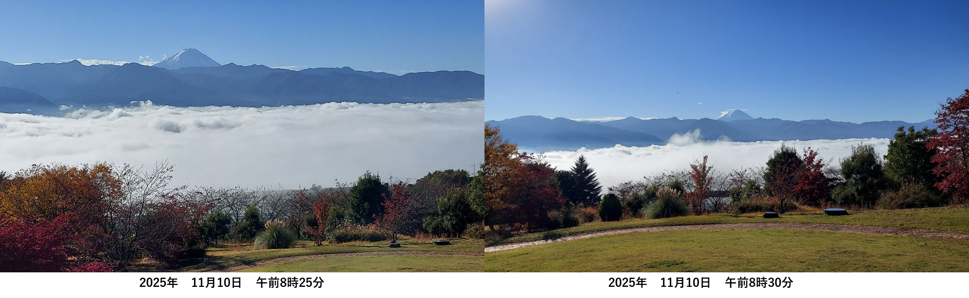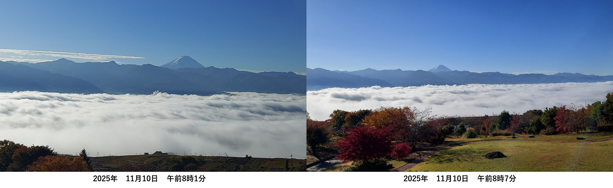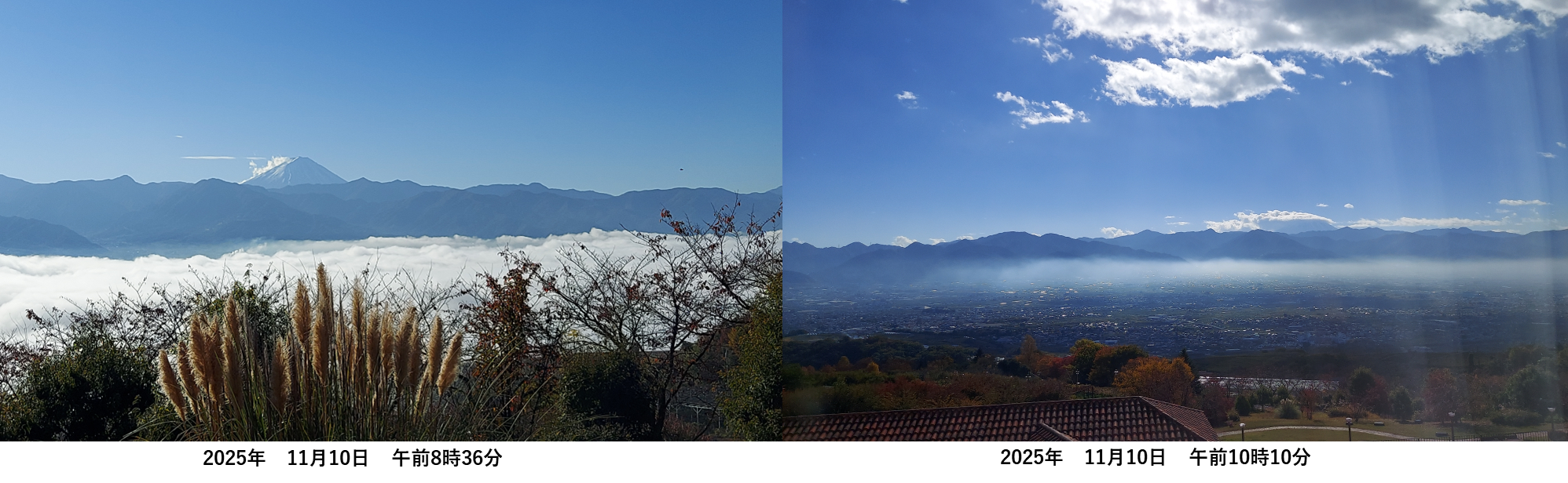 しかし、災い転じて福とやら、この日曜日の雨が月曜日朝の雲海をお膳立てしてくれたのでした。翌朝起きて窓をあけると、一面の雲海が眼下に広がっていました。まさに甲府盆地が綿布団ですっぽりと覆われているようでした。しばらく見とれていましたが、気を取り直して外に出て写真をたくさん撮りました。その時から気になっていたのですが、雲海というのはいつまでも留まってはくれないもので、時間の経過とともにすこしずつ変化していたました。写真を撮っていた8時1分から8時36分までの間でも、雲海は少しずつ変化しています。下の写真を時間の経過とともに注意してご覧ください。生憎、順次場所や倍率を変えて撮影していたので、同じ大きさ、アングルではありませんが、すべてホテルの前庭周辺でおおよその標高やロケーションは変わりません。