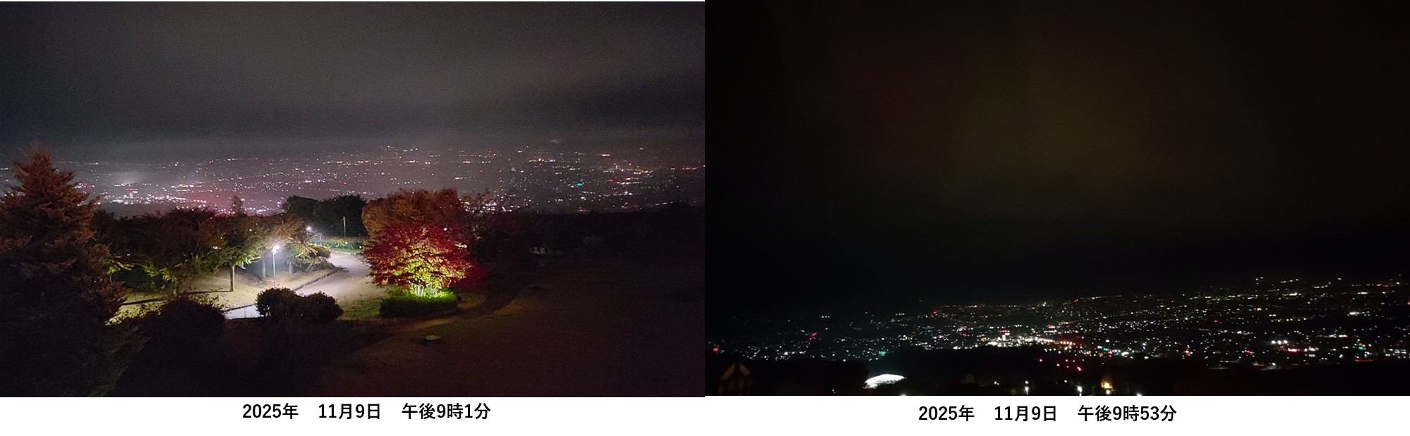 場所は山梨県山梨市のフルーツパーク内のホテルです。「新日本三大夜景」という謳い文句につられて日曜日から月曜日にかけて宿泊したのですが、日曜日は午後から夕方まであいにくの雨。夜になって雨はあがりましたが、下の写真にように靄がかかり遠方までの視界が得られず、せっかくの新日本三大夜景を満喫することができませんでした。