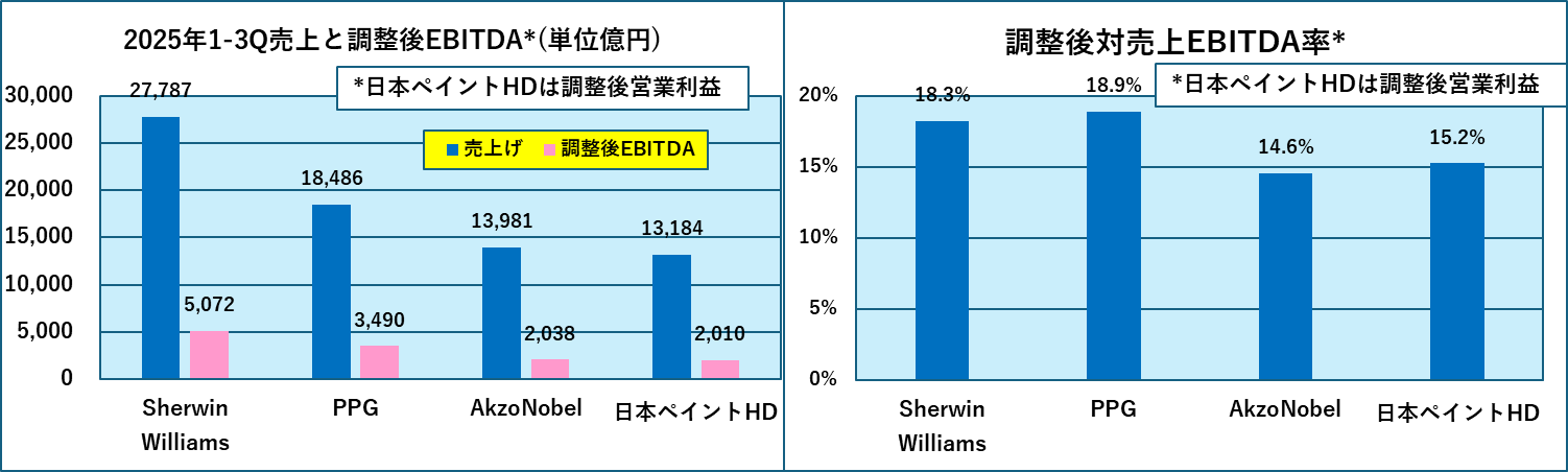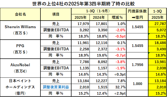 塗料メーカー世界上位4社の2025年第3四半期終了時の決算比較