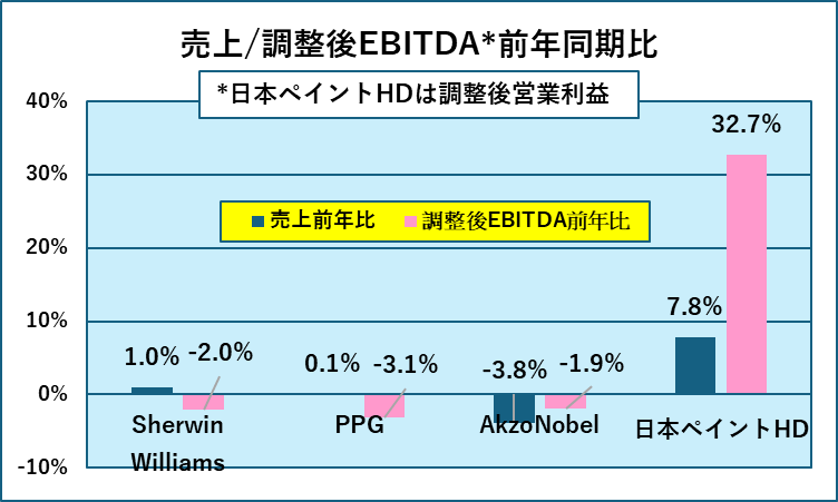 さらに、前年比においては、売上及び調整後のEBITDAいずれにおいても日本ペイントホールディングスが圧倒しています。(上位3社は調整後のEBITDAですが、日本ペイントホールディングスは調整後営業利益の数値であり、その差は表中の数字以上に大きいと思われます)