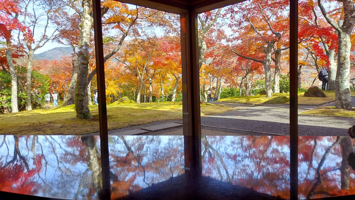 こうした机に映る紅葉と外の景色の一体化では、京都八瀬の瑠璃光院の夜景が有名ですが、こちらはこの建物のおかげで昼間に右のような景色を楽しむことができるのです。とは言え左の写真をよく見ていただきますと机がたくさんあり、右のような写真を撮るためには一番前の机に座らなければ撮れないのです。座席は基本的に列に並んだ順に案内されますので、一番前の机に座れるとは限りません。希望すれば一番前の机が空くのを待つことはできますが、それも面倒なので順番通りに座席につきました。前から2番目に机でした。