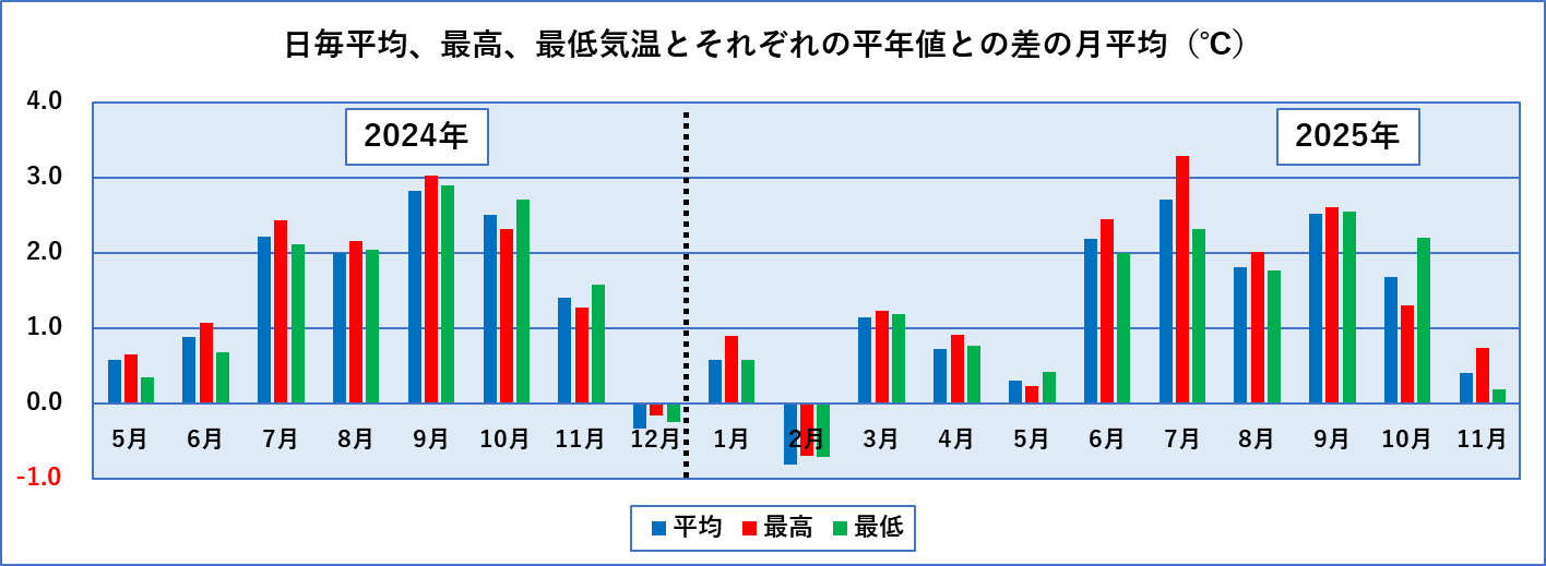 昨年5月以降の日毎平均、最高、最低気温とそれぞれの平年値との差の月平均(℃)を図で示します。