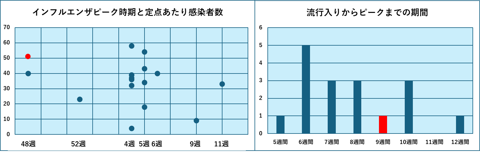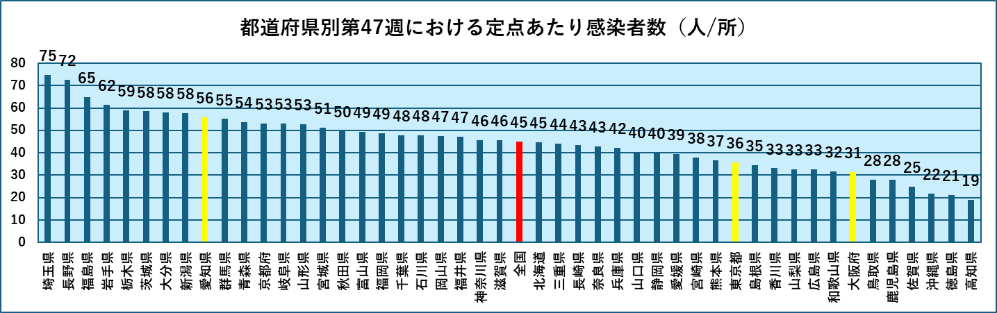 まず、ピーク時期ですが、第48週というのは、2004年以降では最も早いピークと同じであり、極めて早い時期の流行だったということです。そしてピーク時の定点あたり感染者数は51名で、これも2004年以降では高い方から3番目であり、かなり大規模な流行であったと言えます。また流行入り(定点あたり感染者が1.0を超えた週)からピークに至るまでの期間は9週間であり、これも2004年以降では長い方から5番目で、長きに渡り感染が広がり続けたことを示しています。まだ20県で感染が増加していますので油断は禁物ですが、今秋金曜日に発表される第49週の感染者数は全国くまなく減少傾向となっていることを期待したいと思います。