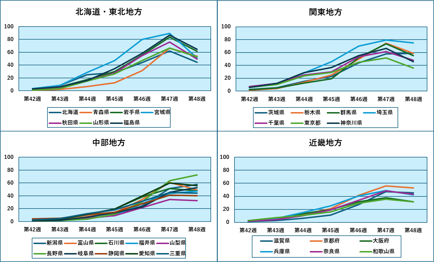 第47週まで最も感染者数が多かった東北地方や関東地方ではピーク超えが明らかな一方、中国・四国地方、九州・沖縄地方では、まだ減少に嘆じていない県がほとんどとなっています。
