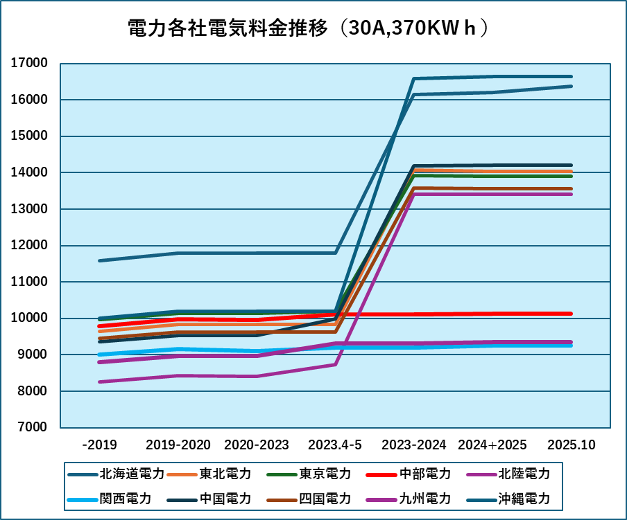 主要電力10社の電気料金の推移を示します。ここでは、契約電流30A、消費電力370KWhの条件での電力料金の推移をグラフ化しています。ただし、横軸は、時間軸ではなく、電力料金変更の節目節目となっています。データは下記サイトから引用させていただきました。