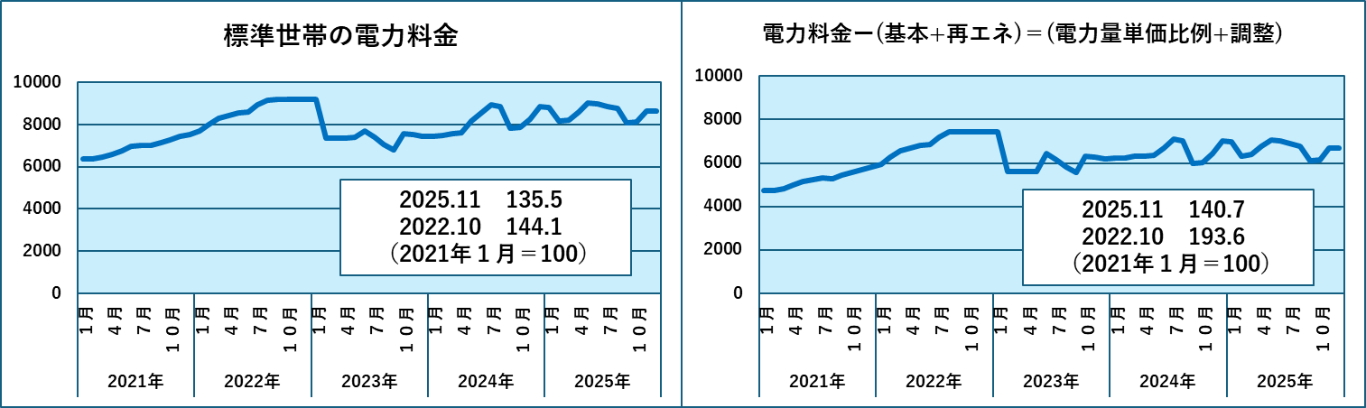 両方とも同じ形のグラフですが、その差が2000円ほどあります。基本料金と再エネ賦課金の合計がそのくらいだということです。仮に2021年1月を100とすると2025年12月の電気料金は135.5になります。一方電力料金から基本料金と再エネ賦課金を差し引いたものは140.7となりました。単純な消費電力に比例する部分の方が大きくなりますがその差はさほどでもありません。それよりもなんだかんだと言っても2022年のウクライナ侵攻後の高騰時からさほど安くなっていないということです。