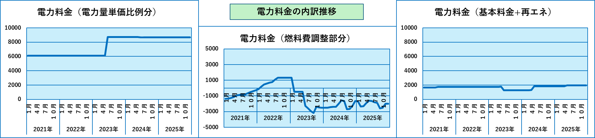 それではこの電力料金を電力料金を電力量単価比例部分、燃料費調整部分、基本料貴+再エネ賦課金の3つにわけて推移を示します。
