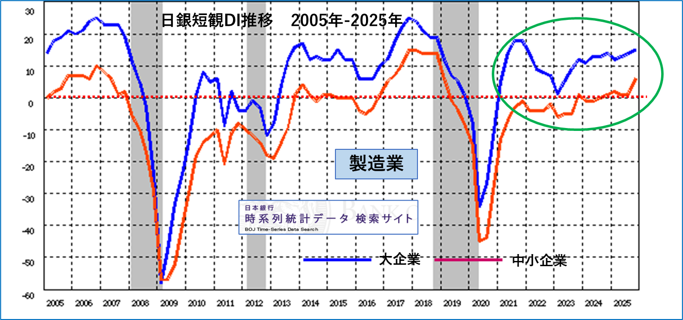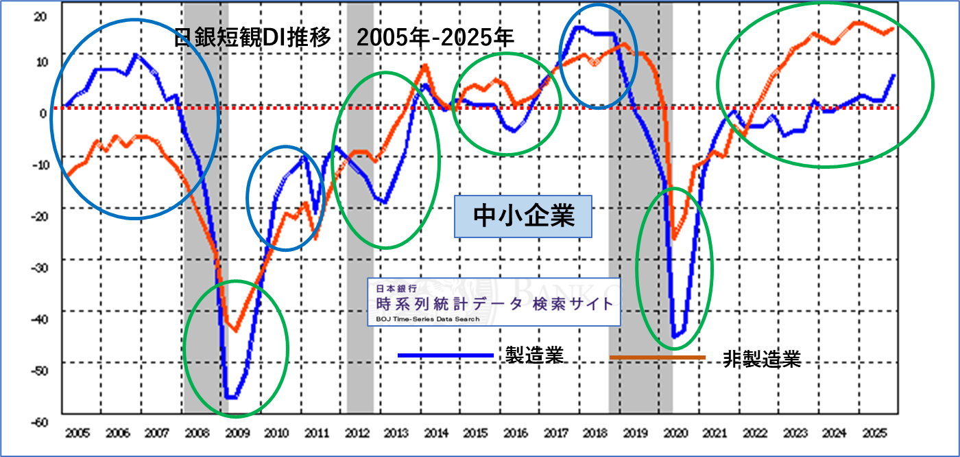 中小企業の製造業と非製造業のDI値の2005年から2025年までの推移です。日銀の時系列データ検索サイトでグラフを描かせました。青丸はDI値が製造業>非製造業、緑丸が製造業<非製造業の期間で、リーマンショック、コロナ禍といった大きな経済停滞時には製造業<非製造業となっています。リーマンショックからの回復期には、製造業と非製造業の線はたびたび交差していましたが、コロナ禍明けでは非製造業が一貫して製造業を上回っています。