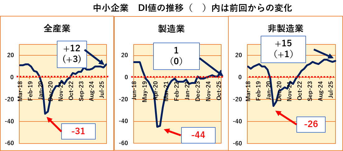12月15日に日銀短観12月調査分が公表されました。全般に改善傾向にあると言える内容でした。いつものようにマスコミが報道しない中小企業のDI値を中心にご紹介します。