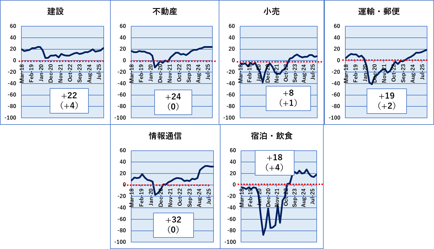 非製造業は、DI値がすべてプラスであり、9月のDI値を下回った業種はありませんでした。コロナ禍により長期間苦しんだ宿泊・飲食業も23年以降安定してプラスとなっています。